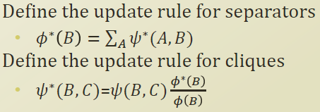 쉽게 설명하면 Potential function P(A,B)에서 A가 관측되어 (Observation ) B가 바뀐다. 즉 Clique ψ(A,B)가 바뀌게 되어 Separator B에도 영향을 준다. 그럼 또 Separator B가 변경되어 뒤의 Clique ψ(B,C)가 변경되고 뒤로 계속 쭉쭉 전파된다.