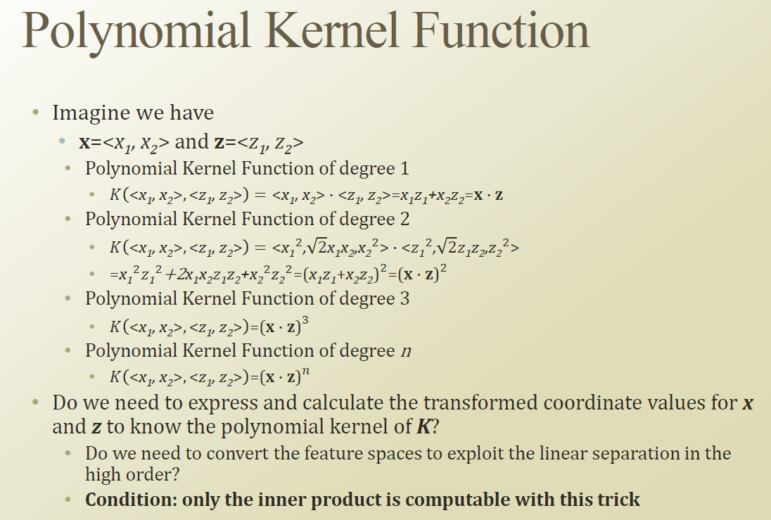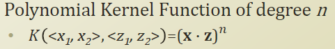 위의 Polynomial Kernel Function of degree 2를 보면 x,z의 2차원 point를 3차로 보내서 내적을 하는것나 , x,z를 먼저 내적해서 3차로 보낸것이 동일하다는 특징을 보인다.