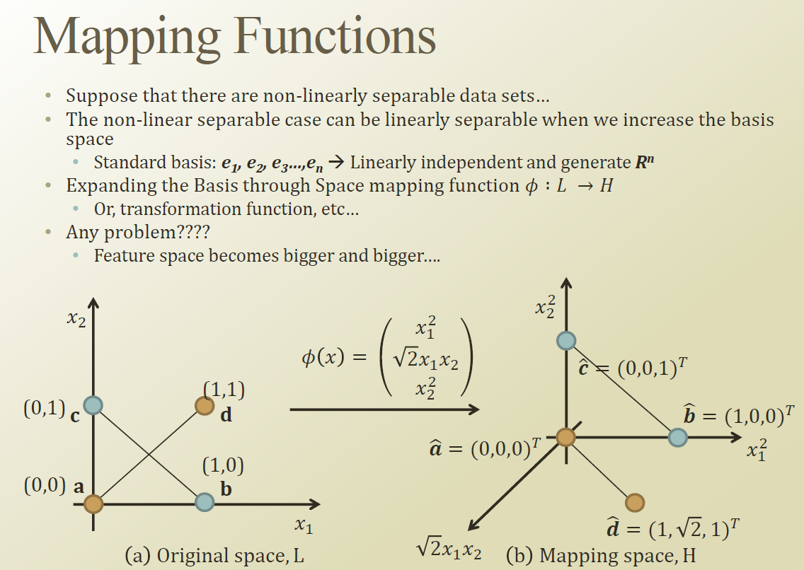 그러면 어덯게 하면 Mapping function을 smart하게 잘 사용 할 수 있을까? 그래서 Kernel이라는 아이디어가 나오게 된다.