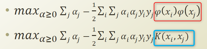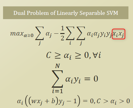 Dual problem 에서의 xi, xj 가 φ를 넣어가지고 다른차원으로 넘겨서 내적을 하겠다는것으로 변경할수 있다.