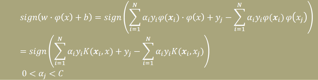 위의 sign (w * φ(x)+b) 의 형태에 아래를 대입해 보면 w가 있는 항도 Kernel의 형태로 변하게 된다.
