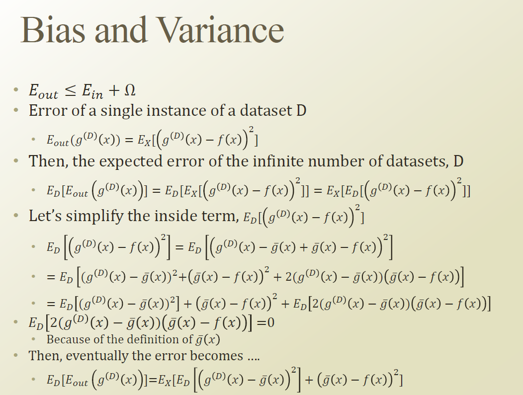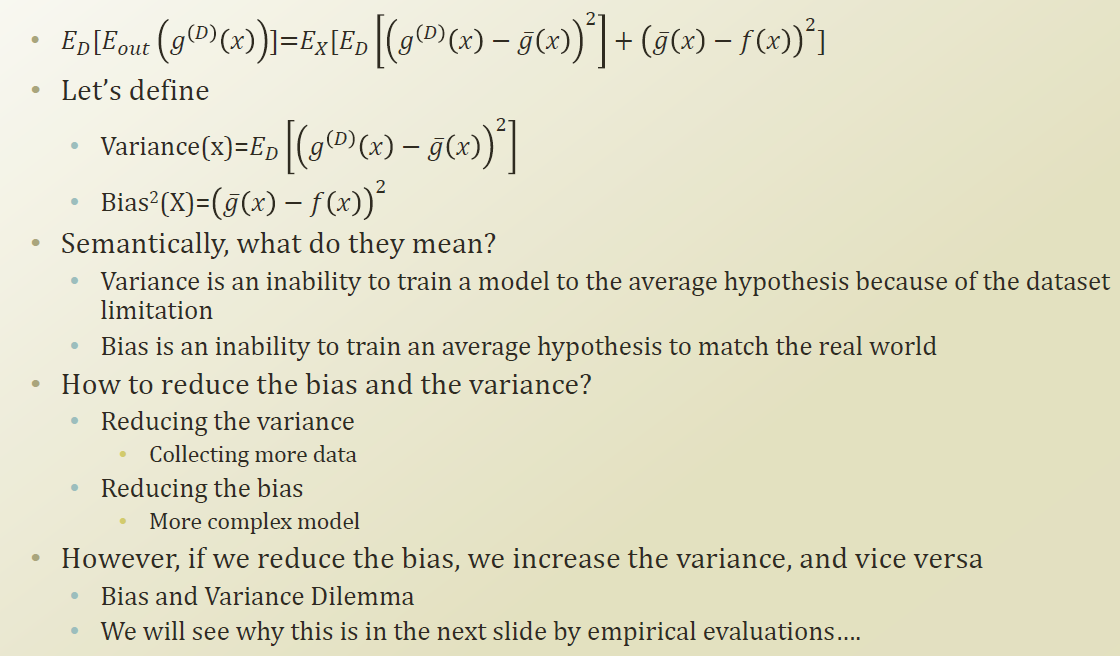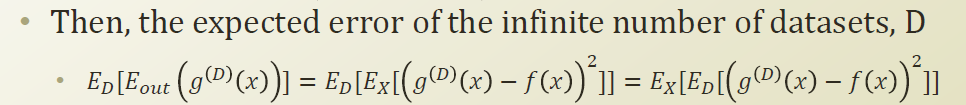g(hat) : 현실의 모든데이터에 대해서 일부를 관측해서 ML을 만드는 과정을 반복한다고 할때, 계속 sampling 될때마다 거기에 맞는 g(D) 를 만들수 있다. 이것을 무한개를 만들어 평균을 내는것이다.