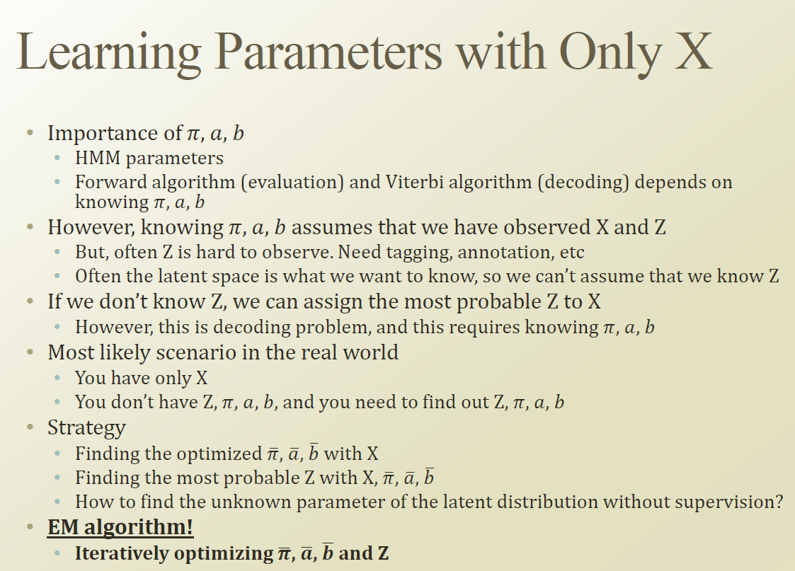 Decoding question 은 supervised learning 에 가까웠다. Traiing case를 통해 parameter(π , a,b)를 다 알고 있다.