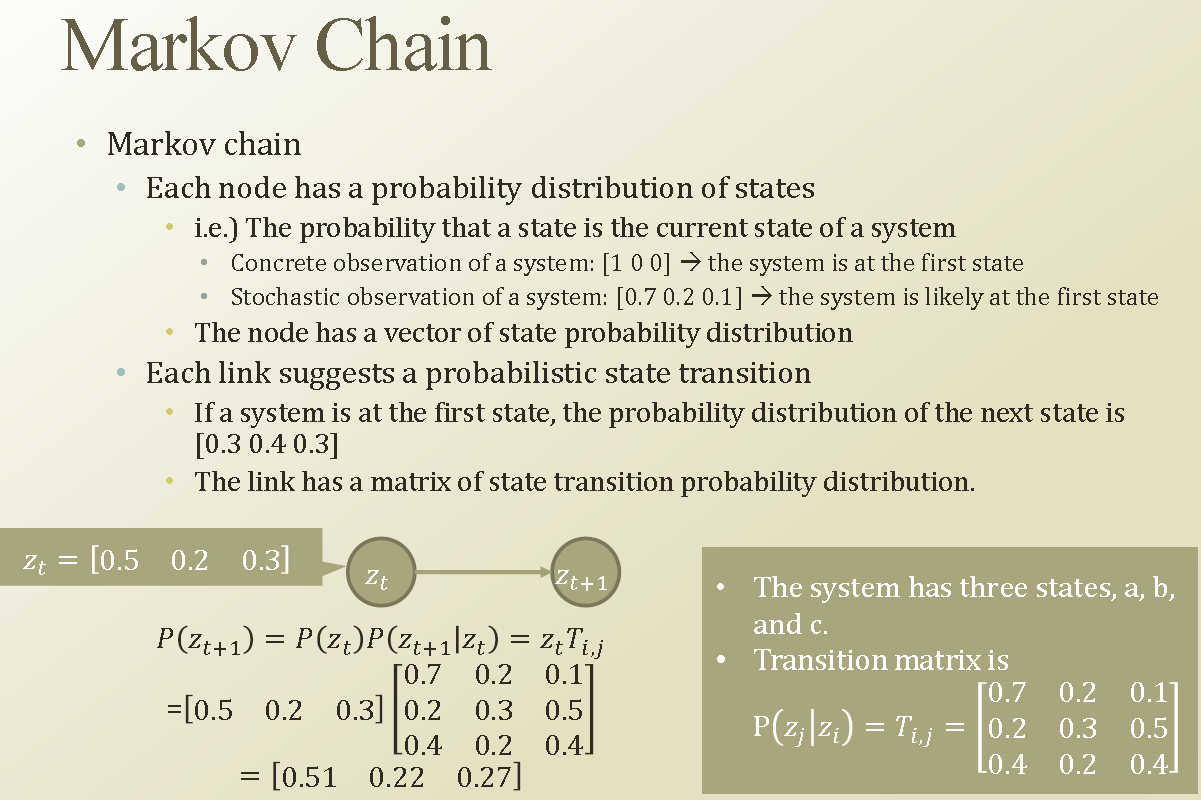 특정 time t 의 한 state 에서 그 다음 state t+1 로는 Matrix를 통해 transition 된다고 해보자.