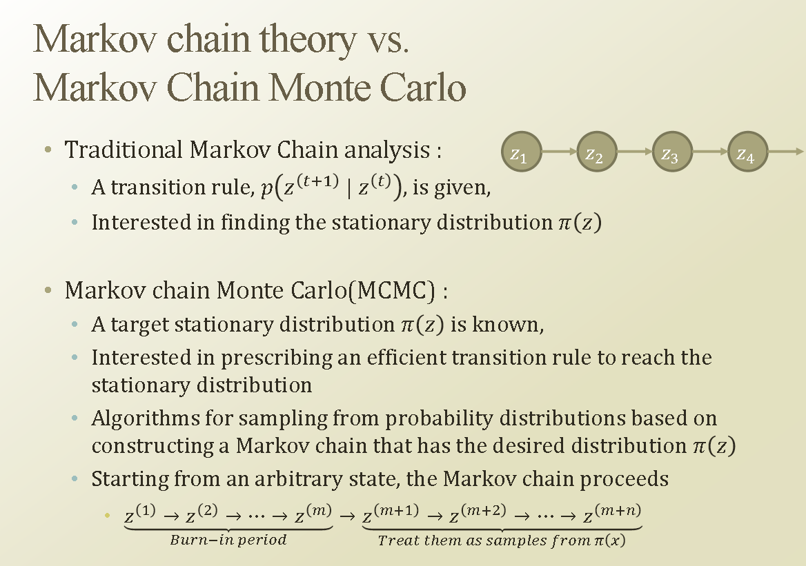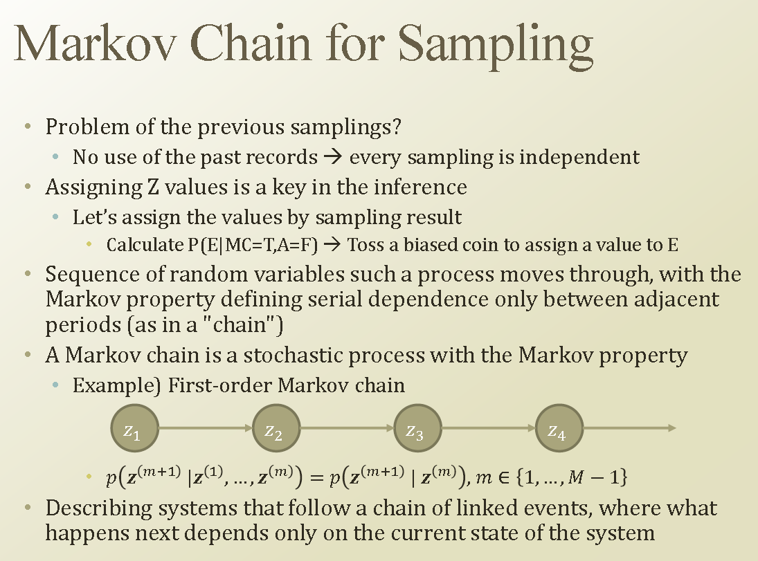Inference는 assignment 가 중요한데 ,transition matrix를 잘 만들어서 , 그것을 활용해서 sampling을 매 term 마다 해보자는것이 MCMC의 내용이다.